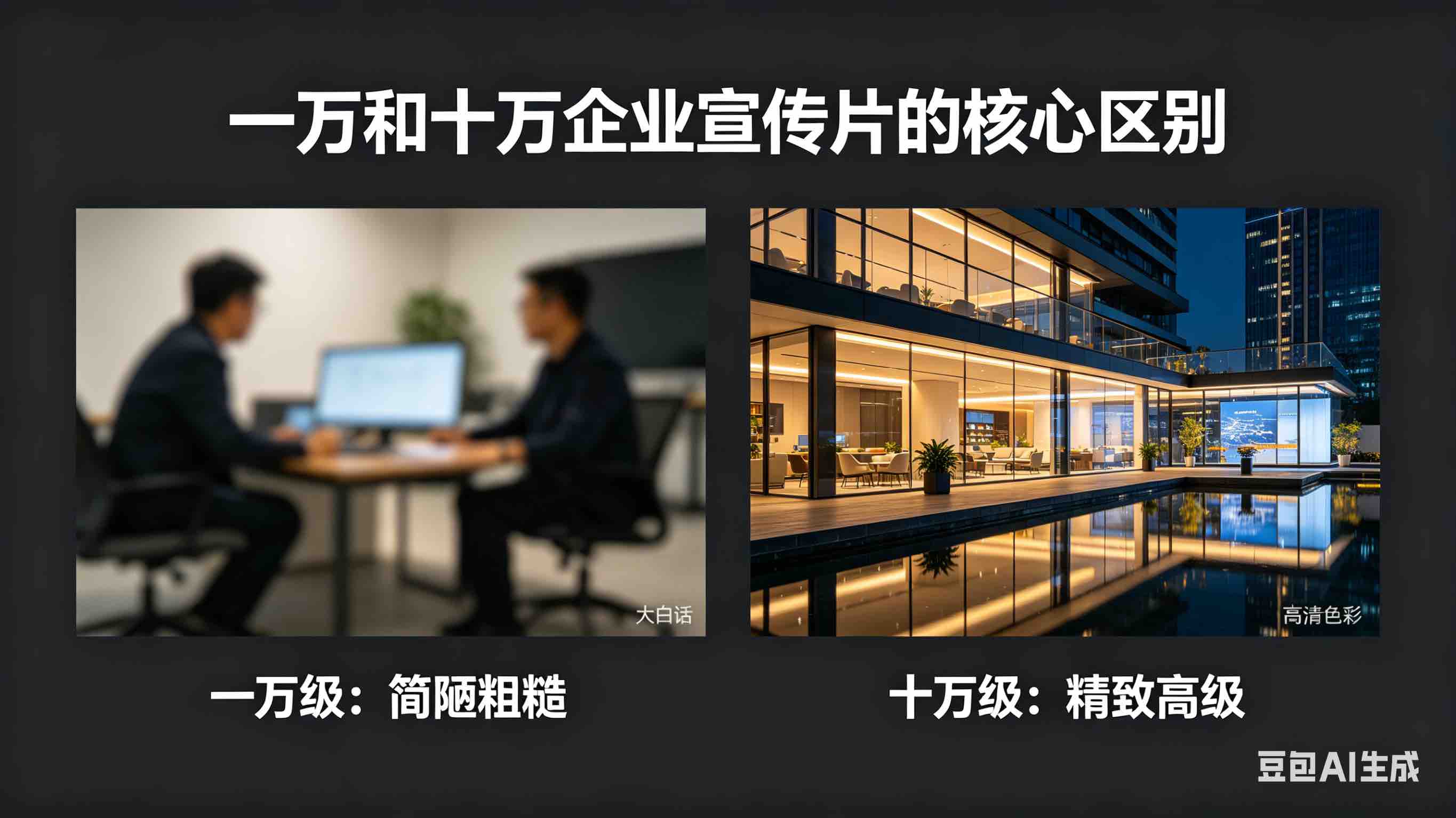 咱先一句话说透核心:一万的宣传片是“完成任务”,能看、能传,但没质感、没记忆点;十万的是“打造精品”,不仅能展示企业,还能提档次、拉印象,甚至帮着谈客户、树品牌。两者差的不是10倍价格,是从策划到后期的全流